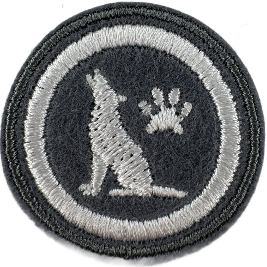 Sprawności harcerskie ZHR żeńskie o średnicy 30mm, haftowana białą nicią na szarym filcu.