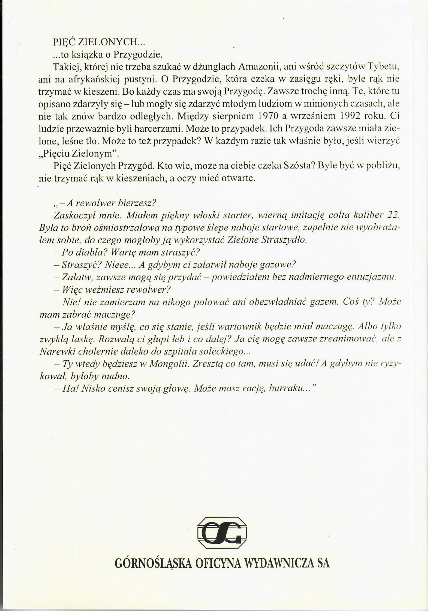 To powieść o uśmiechniętej harcerskiej przygodzie. Przygodzie, której nie trzeba szukać w dżunglach Amazonii, ale która czeka w zasiegu ręki, byle rąk nie trzymać w kieszeni, byle mieć je zawsze gotowe do pomocy, do harcerskiej Służby. A że każdy czas ma swoją, odmienną potrzebę Służby i swoją, niepowtarzalną Przygodę, więc PIĘĆ ZIELONYCH to opowieść o przygodach typowych dla pięciu różnych okresach w dziejach harcerstwa: